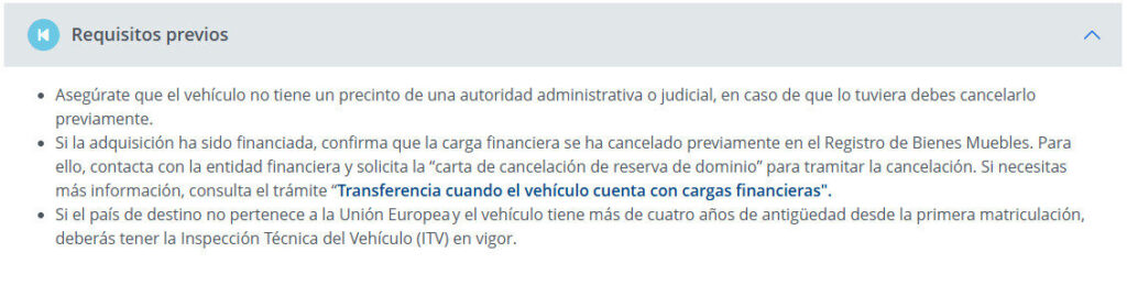 Para matricular un vehículo en España será necesario pasar la ITV española. No obstante, según la Dirección General de Tráfico, en el trámite de baja en el país de origen la ITV solo es obligatoria si el vehículo se exporta fuera de la Unión Europea y tiene más de cuatro años de antigüedad.