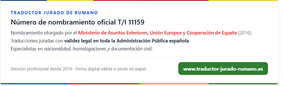 Esto significa que si tienes un título o certificado de notas expedido en Rumanía, no necesitas apostillarlo. Basta con que esté emitido correctamente por la autoridad educativa competente y acompañado de su traducción jurada al español.